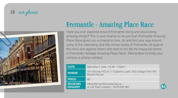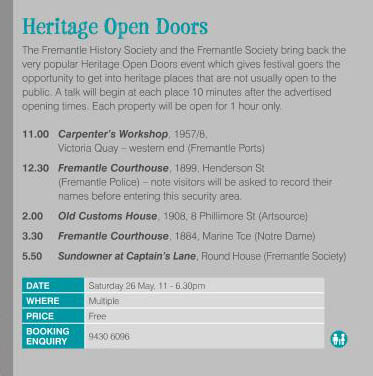 The Heritage Festival is nearly here with events commencing on 25th May through to 4th June 2012. The Fremantle History Society and the Fremantle Society have collaborated to provide some interesting events for their members and the general public. Some of the events are highlighted below. We hope to see you there.