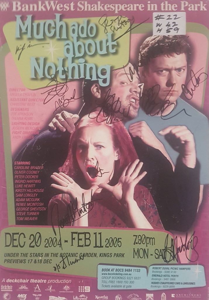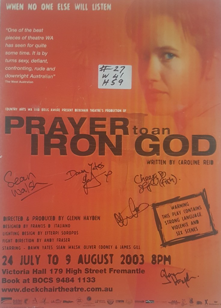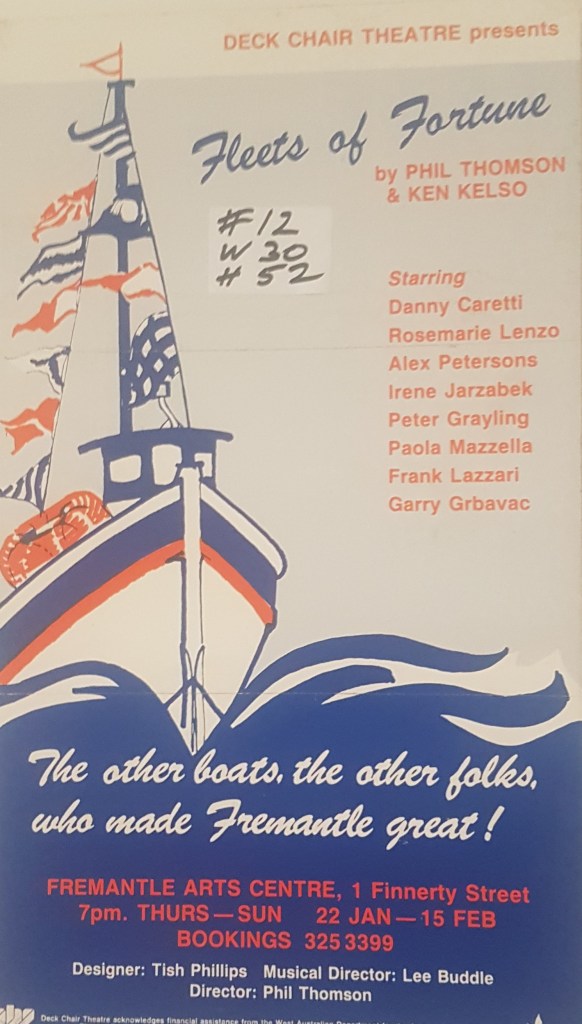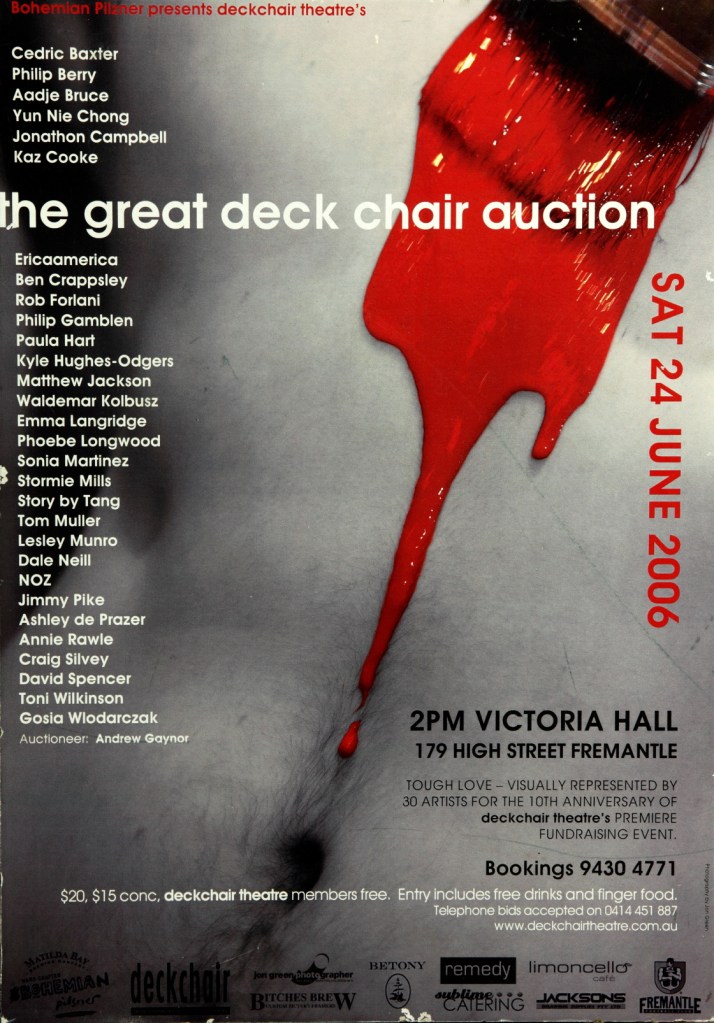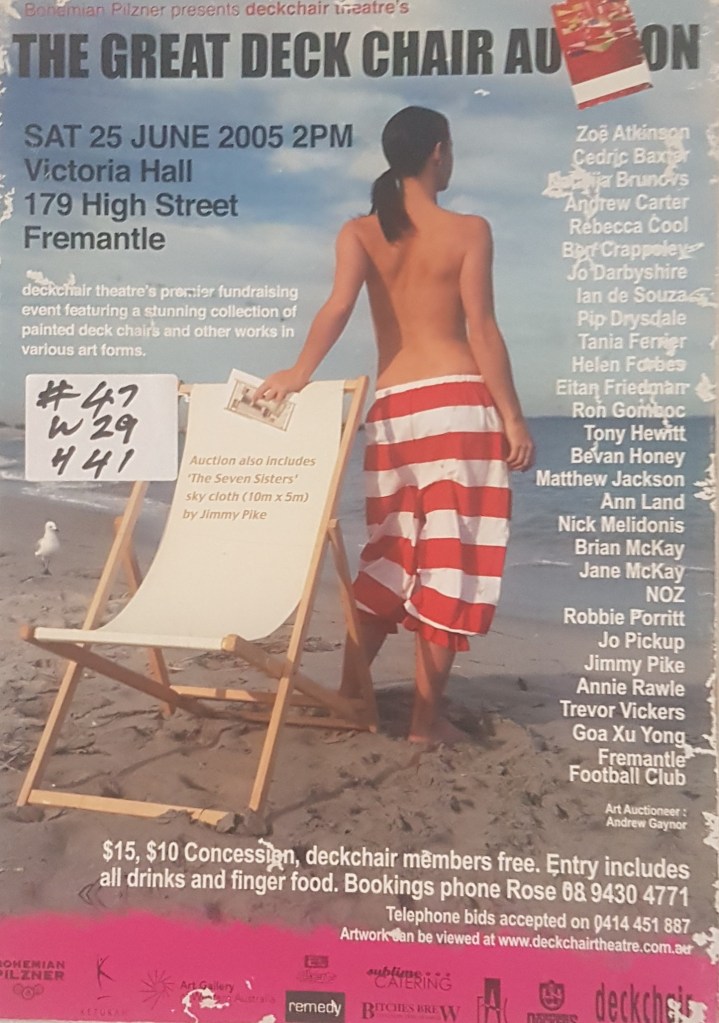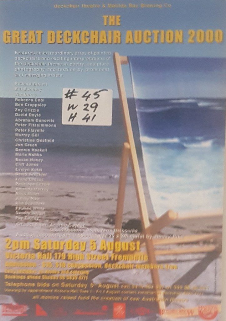The Deck Chair Theatre operated from 1984 – 2012. During that time it produced over 100 performances. The mounted posters in this collection represent just some of the plays. The Fremantle History Society worked for over 12 years to save the substantial archives of the theatre and the majority of materials are now held by the State Library of WA. Also held are digitised copies of audio visual materials which the Society was able to digitise with the help of a grant from the WA History Foundation. The posters in this collection are duplicates of posters now at the State Library and we are offering them for sale by way of a silent auction.
